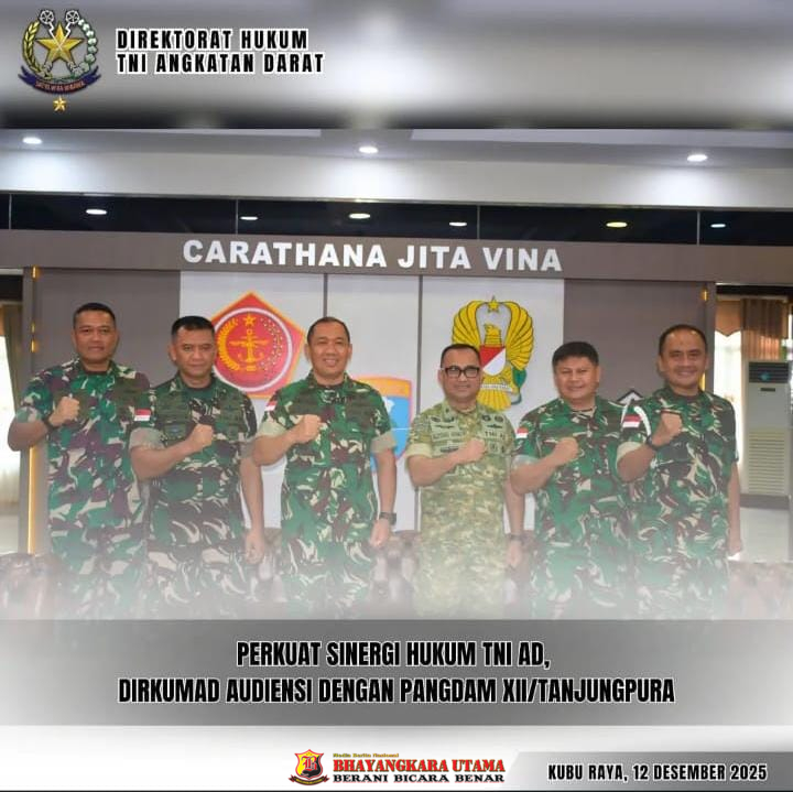 BHAYANGKARAUTAMA ID —Kubu Raya,14 Desember 2025 , Ditkumad.mil.id – Direktur Hukum TNI Angkatan Darat (Dirkumad) melaksanakan audiensi bersama Panglima Kodam XII/Tanjungpura. Kegiatan audiensi tersebut berlangsung dalam suasana penuh keakraban dan dialog konstruktif, serta didampingi oleh Kepala Hukum Kodam XII/Tanjungpura.