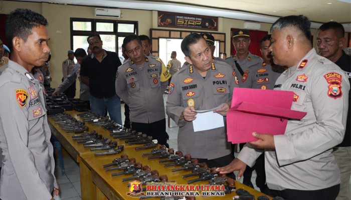 Tim Monitoring dan Evaluasi Inspektorat Pengawasan Umum Kepolisian Negara Republik Indonesia (Itwasum) Polri melaksanakan pemeriksaan senjata api  (Senpi), Amunisi dan Ketahanan Pangan di Mapolres Halmahera Utara, Senin (16/01/2025).