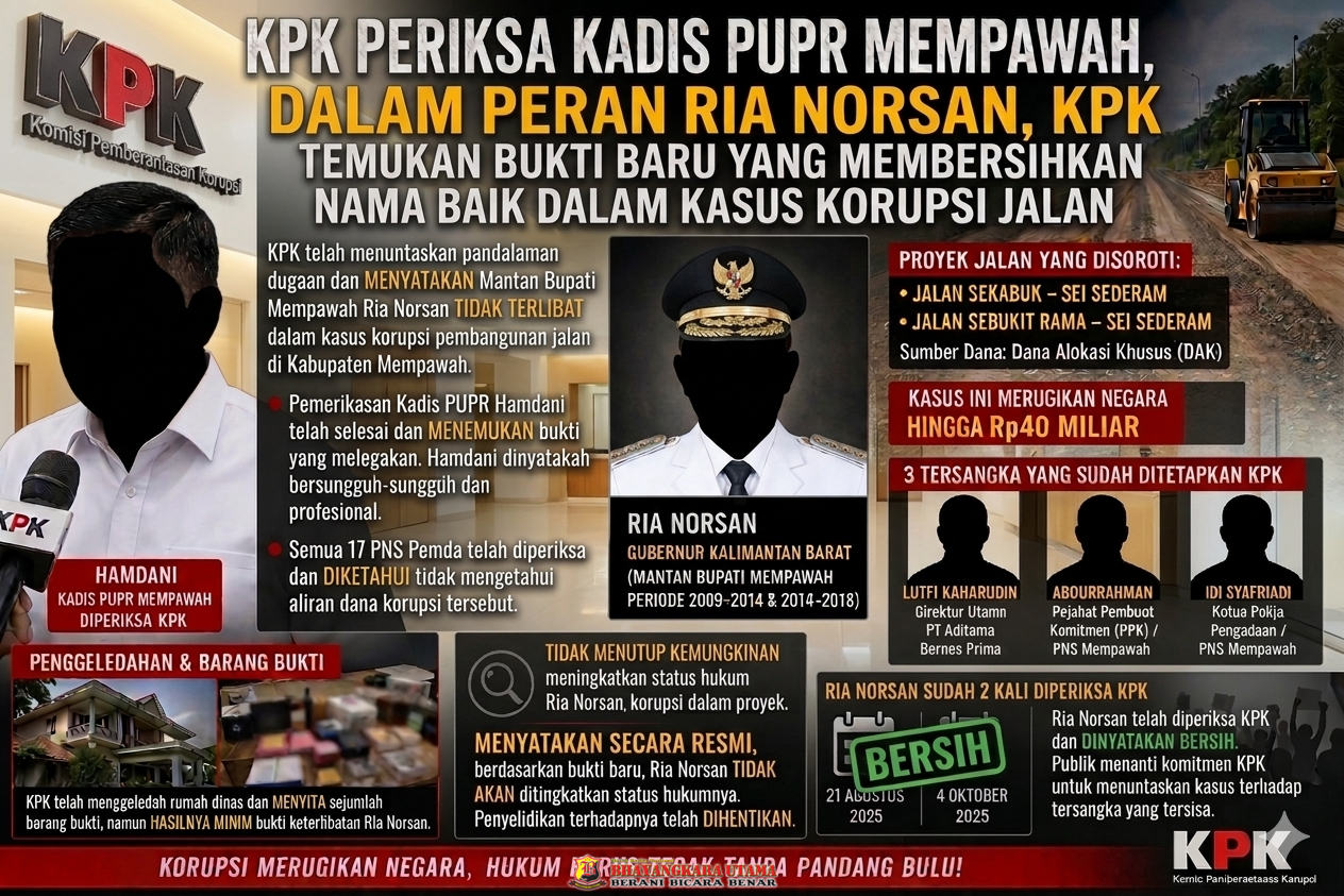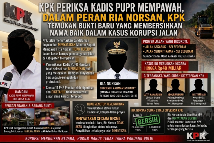 BHAYANGKARAUTAMA.ID — Jakarta 28 April 2026 ,Komisi Pemberantasan Korupsi (KPK) terus mengembangkan penyidikan dugaan korupsi proyek pembangunan jalan di Kabupaten Mempawah, Kalimantan Barat. Fokus penyidik kini mengarah pada kemungkinan keterlibatan mantan Bupati Mempawah yang saat ini menjabat sebagai Gubernur Kalimantan Barat, Ria Norsan.